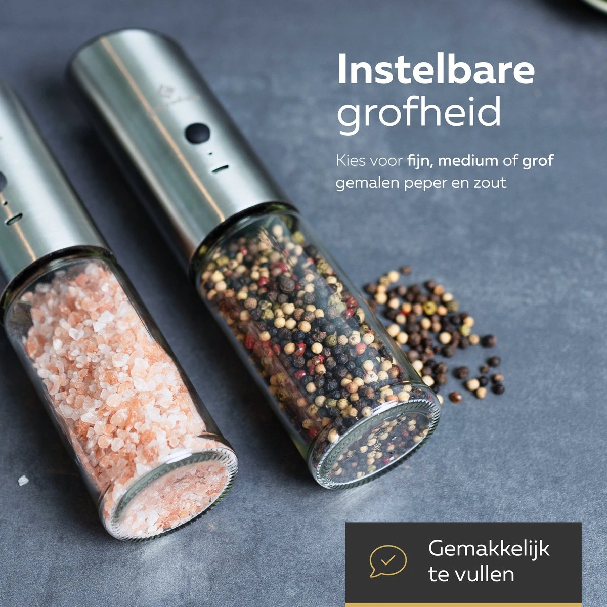 โถ Gravitity Operationโข- simpel & efficiรซnt โ Met de elektrische peper- en zout set van 101Products maak je het jezelf gemakkelijk tijdens รฉn na het koken. Automatisch malen in letterlijk รฉรฉn handomdraai: nooit meer draaien, alleen nog omkeren.