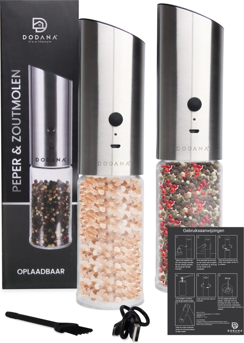 DODANA Premium Peper – & Zoutmolen Elektrisch – 1 Stuk – Pepermolen – Zoutmolen – Oplaadbaar – USB – Elektrische Pepermolen – RVS – Zwaartekracht Functie – LED Lamp – Nl Handleiding – Incl Borsteltje