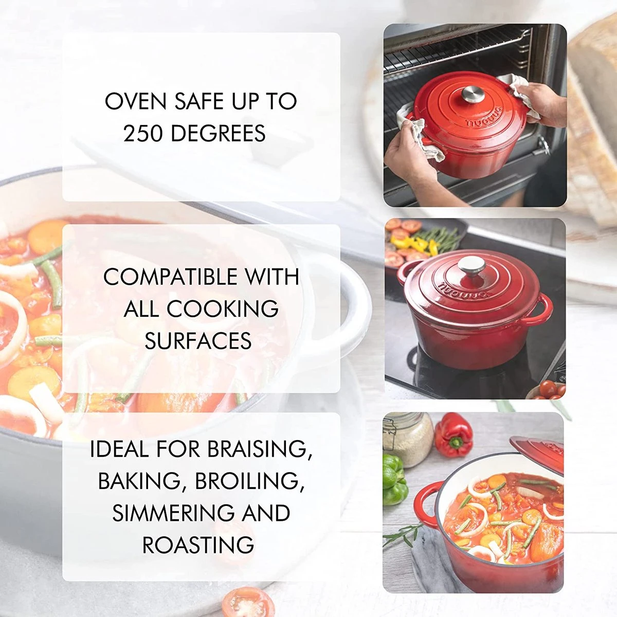 Nuovva Gietijzeren Braadpan Antiaanbaklaag Met Deksel – Sudderpan Rood – Rond – Ø24 Cm – 4.7 Liter – 100% PFAS & PFOA Vrij – Geschikt Voor Alle Warmtebronnen – Elektrisch – Gas – Halogeen – Inductie – Keramisch