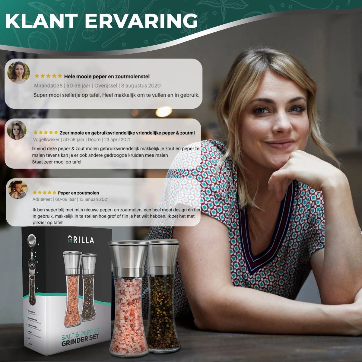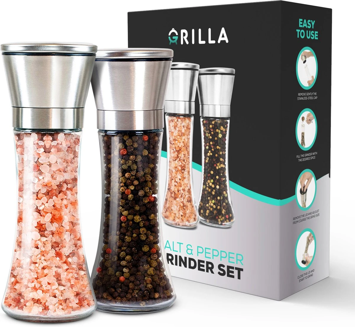 We kennen het allemaal wel, die veel te dure kleine zout- en pepermolentjes die je in de winkel kan kopen. Of die Ooo zo mooie kartonnen cilinders, die veel mensen hun kast hebben staan. Waarom staan al die zout- en peperstellen altijd in de kast denk je? Klopt, ze zijn gemaakt om weg te gooien, niet goed voor de natuur of je vrouw haar ogen haha, grapje… Maar zonder te dollen hebben wij de oplossing, de Zout- en Pepermolen set van Grilla. Je kan ze in een handomdraai bijvullen en uitgerust met roestvrij-staal en glas van de hoogste kwaliteit, zijn ze niet alleen goed voor de natuur, je kan ze ook eens op het aanrecht of tafel laten staan, lekker makkelijk toch!